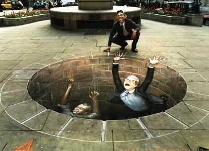 There is a deep hole in the sidewalk.