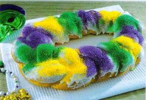 A favorite Mardi Gras tradition is the King Cake!  It comes in a number of styles.  The most simple, said to be the most traditional, is a ring of twisted bread similar to that used in brioche topped with icing or sugar, usually colored purple, green and gold (the traditional Mardi Gras colors) with food coloring.  They are traditionally deep-fat-fried as a doughnut would be, and there are many variants, some in more recent years featuring a filling – the most common being cream cheese, praline, cinnamon, or strawberry.  A so-called “Zulu King Cake” has chocolate icing with a coconut filing, because the krewe of Zulu parade’s most celebrated throw is a coconut.  And the special surprise in the cake is a small plastic baby!  You’ll have a lucky and prosperous year if you get the slice with the baby in it.  But all the luck comes with an obligation…you have to proved next year’s King Cake!!